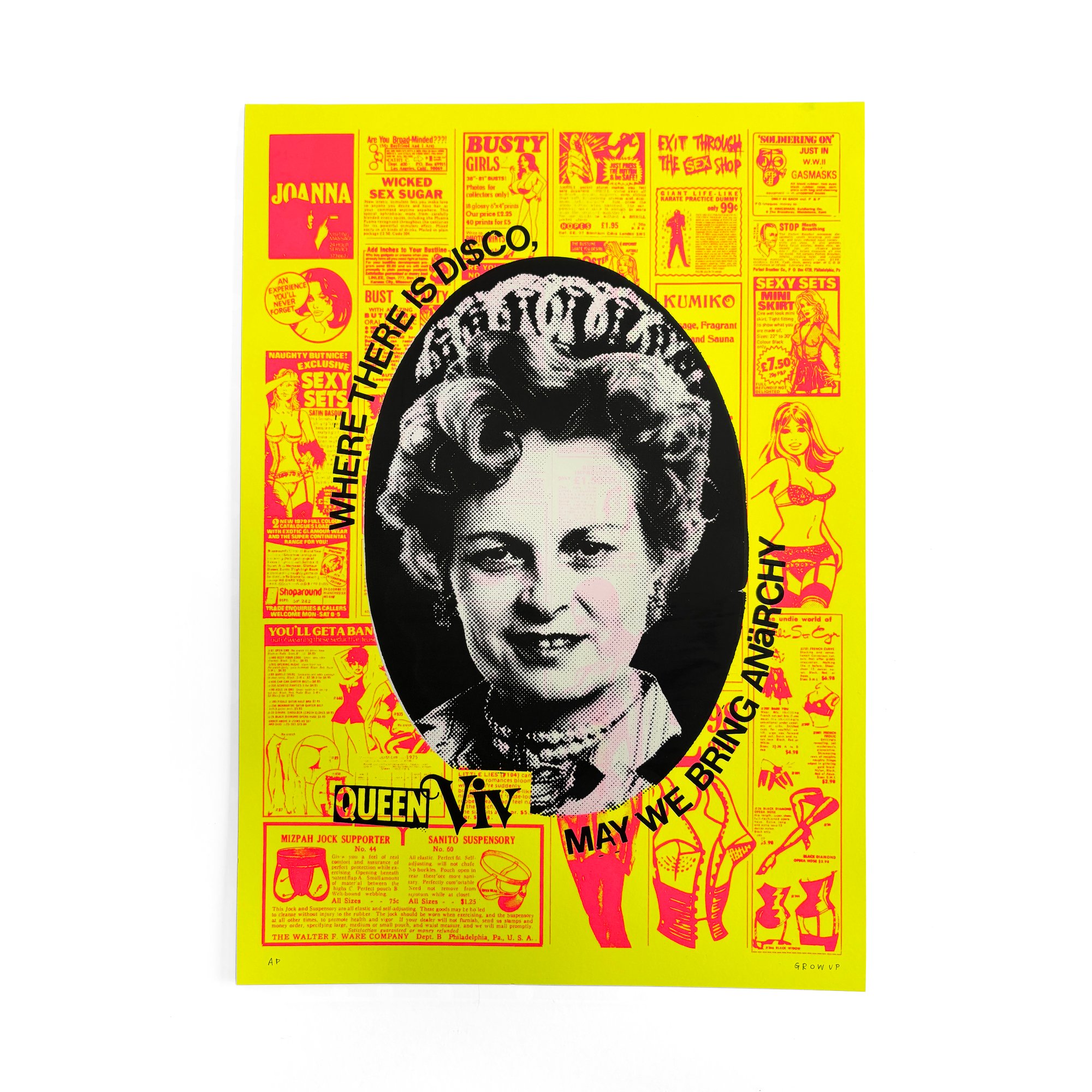 3 colour screen print on neon yellow card, A3 Edition of 76 Signed and numbered by Grow up. Posthumous collab with Jamie Reid's estate. Portrait photo by Fegus Greer. *With thanks x